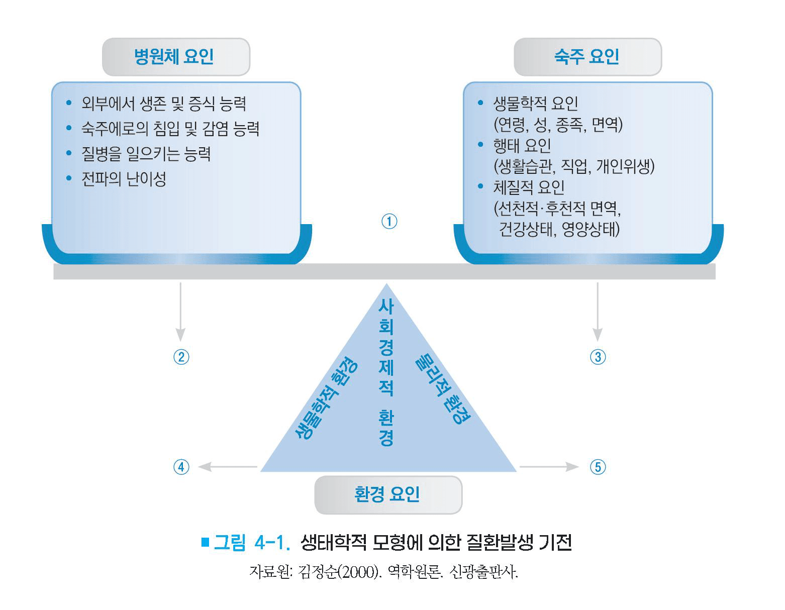 – 그림 4-1의 ①은 평형상태, ②는 병원체 요인의 변화, ③은 개인 또는 집단의 면역수준 변화로 인한 숙주의 감수성 변화, ④와 ⑤는 환경 변화