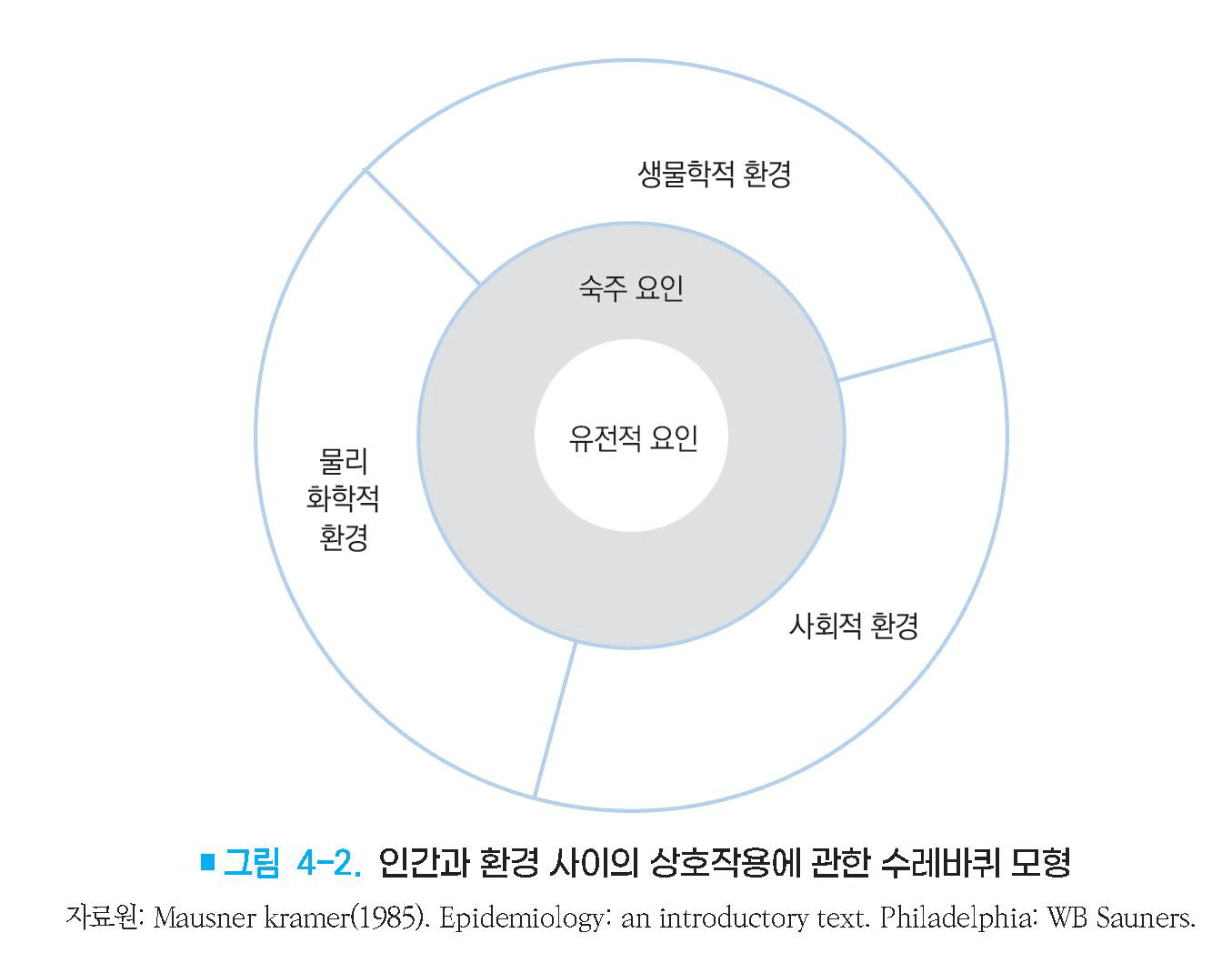 – 수레바퀴의 중심에는 유전적 소인을 가진 숙주가 있고, 그 숙주를 둘러싸고 있는 환경은 생물학적, 물리적·화학적, 사회적 환경으로 구분, 질환의 종류에 따라 각 바퀴를 구성하는 각 부분의 면적이 달라진다.