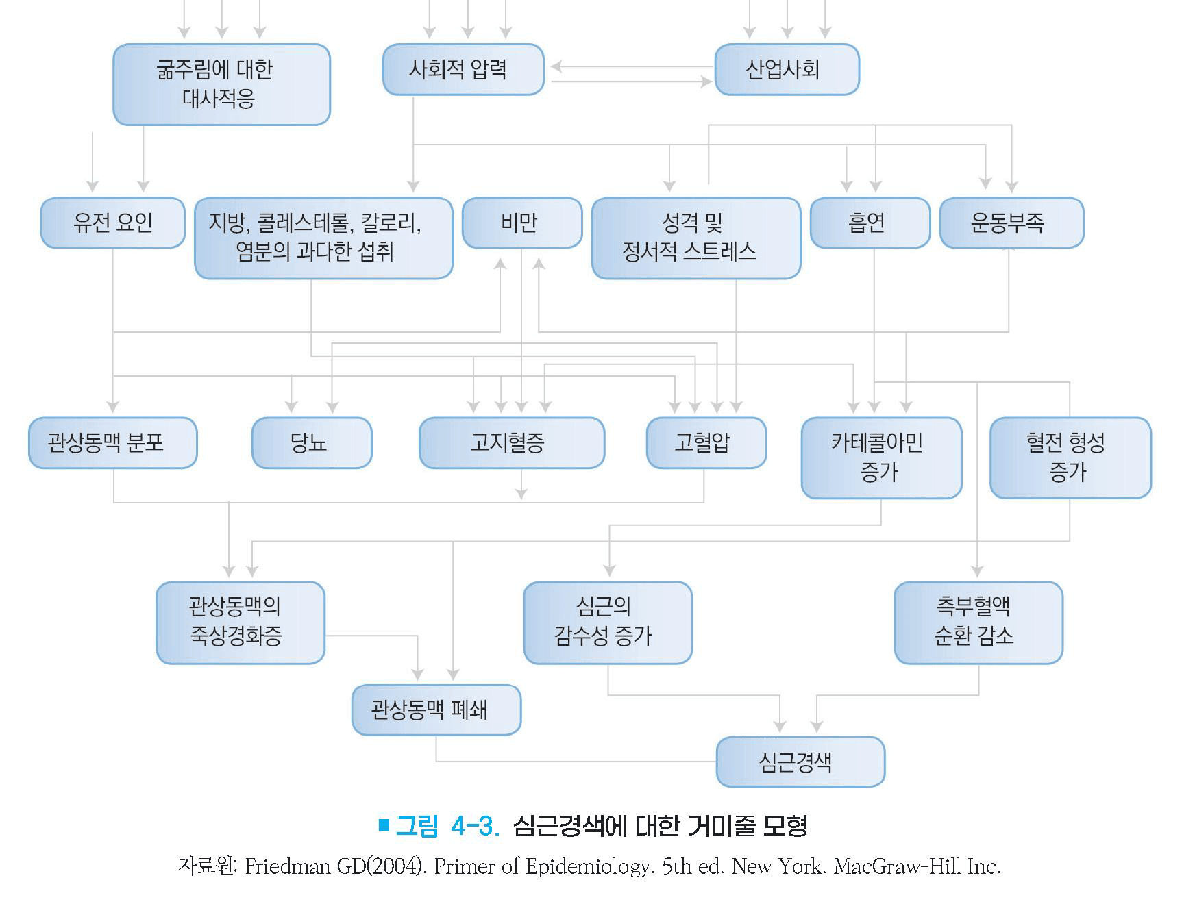 – 질환발생에 대한 원인 요인들의 기여 정도에 중점을 두어 표현함으로 써 역학적 분석에 도움(그림 4-2).