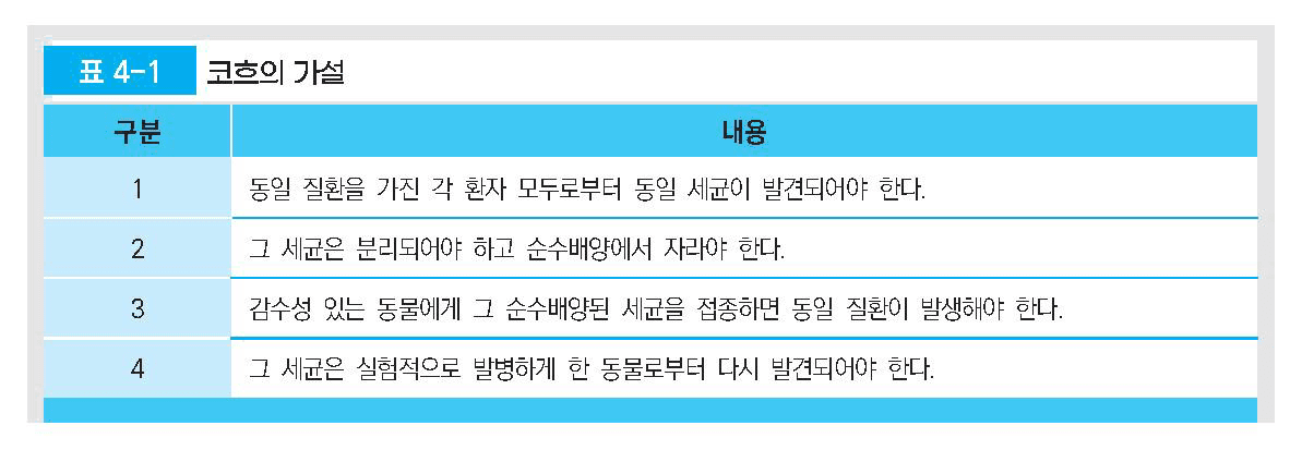 – 19세기 코흐의 가설(Koch’s postulates) : 탄저병과 결핵의 병인론을 정립하는 과정에서 특정균과 감염성 질환 사이의 인과관계를 판단하기 위해서는 다음과 같은 조건을 충족하여야 한다(표 4-1).