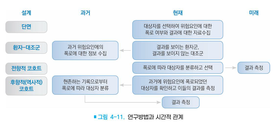단면연구, 환자-대조군 연구, 코호트 연구가 있다(그림 4-11).