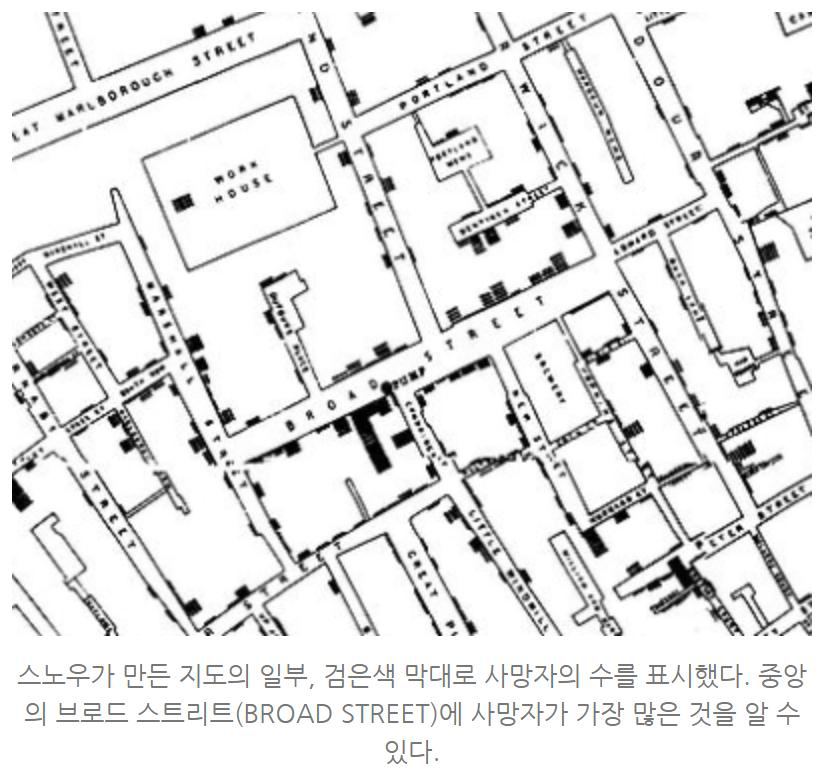 – 지역 분포의 대표적인 예는 1854년 스노우(Snow)가 런던의 콜레라 발생 사례를 그 지역 내의 지도 위에 표시한 것 : 점지도(spotmap)을 통해 사망률의 지역 분포 차이를 관찰함 으로써 사망빈도가 높은 지역의 펌프를 차단하여 질환발생을 막은 것