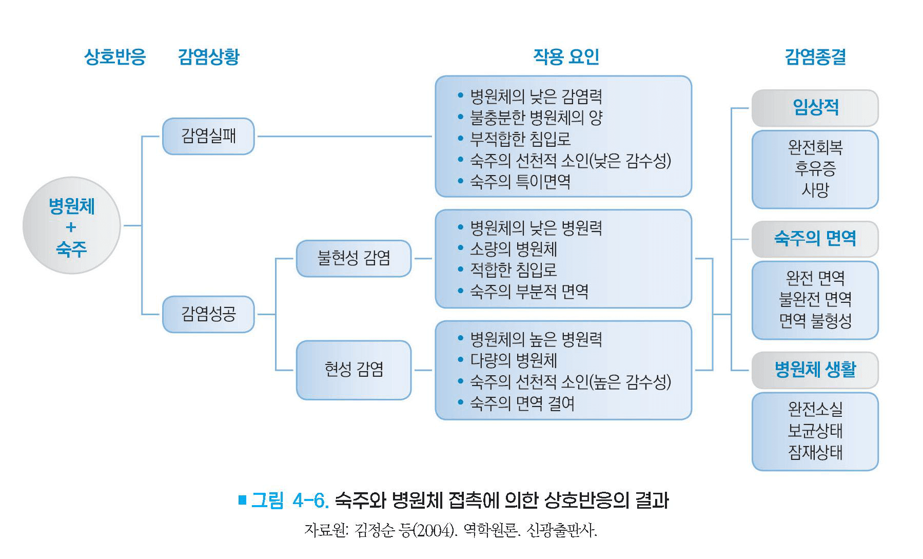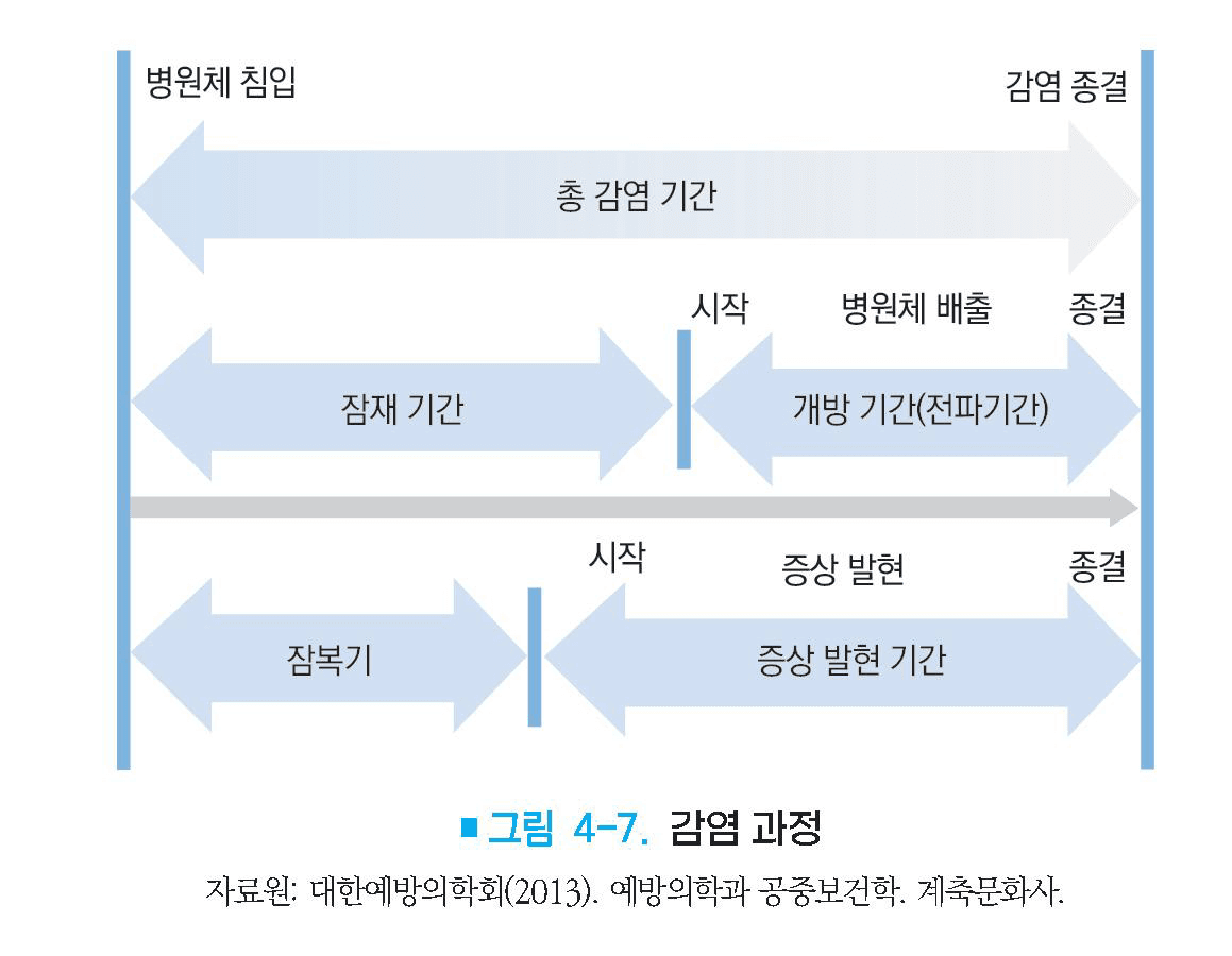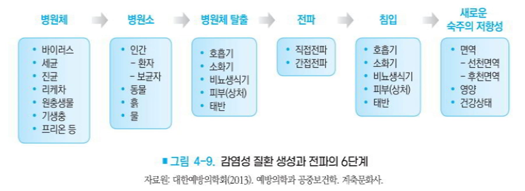 – 감염성질환 생성의 6단계 병원체 -> 병원소 -> 병원체탈출 -> 전파 -> 침입 -> 새로운 숙주의 저항성(그림 4-9).