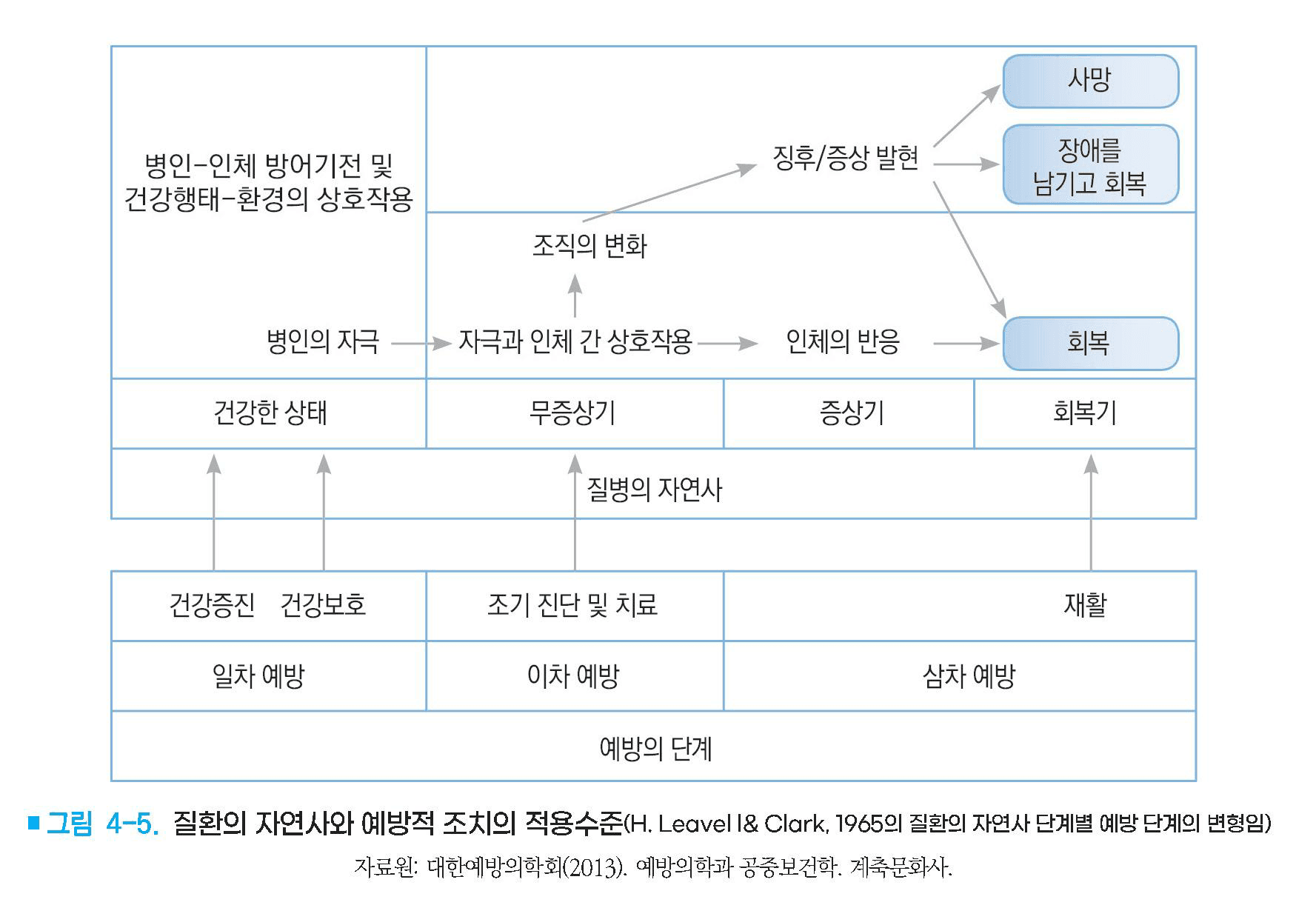– 질환의 발생에서 회복에 이르는 질환의 자연사 단계마다 예방조치(그림 4-5).