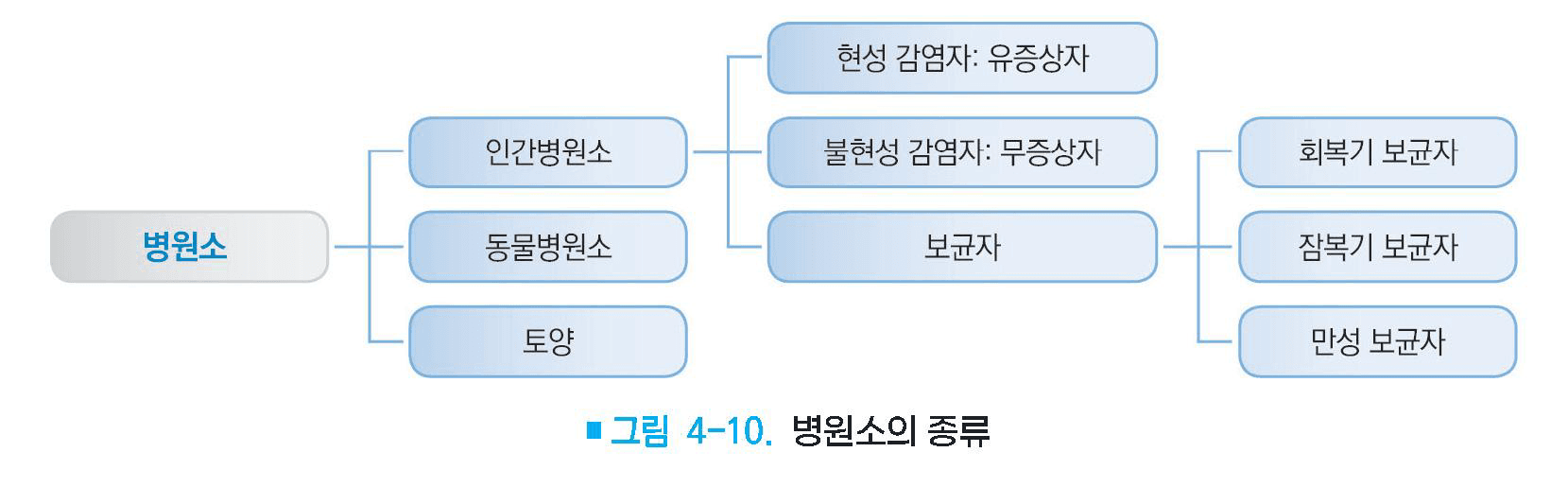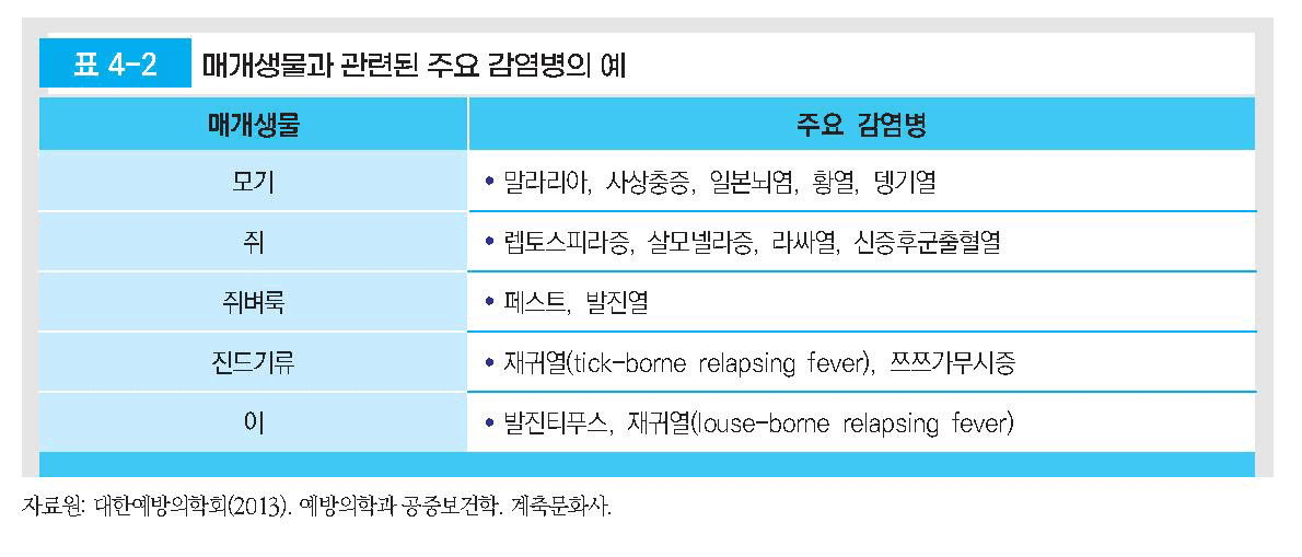 – 병원체가 생존하고 증식하면서 감수성 있는 숙주에 전파시킬 수 있는 생태학적 위치에 해당하는 인간, 동물, 곤충, 식물, 환경적 무생물(토양, 물) 등(그림 4-10)