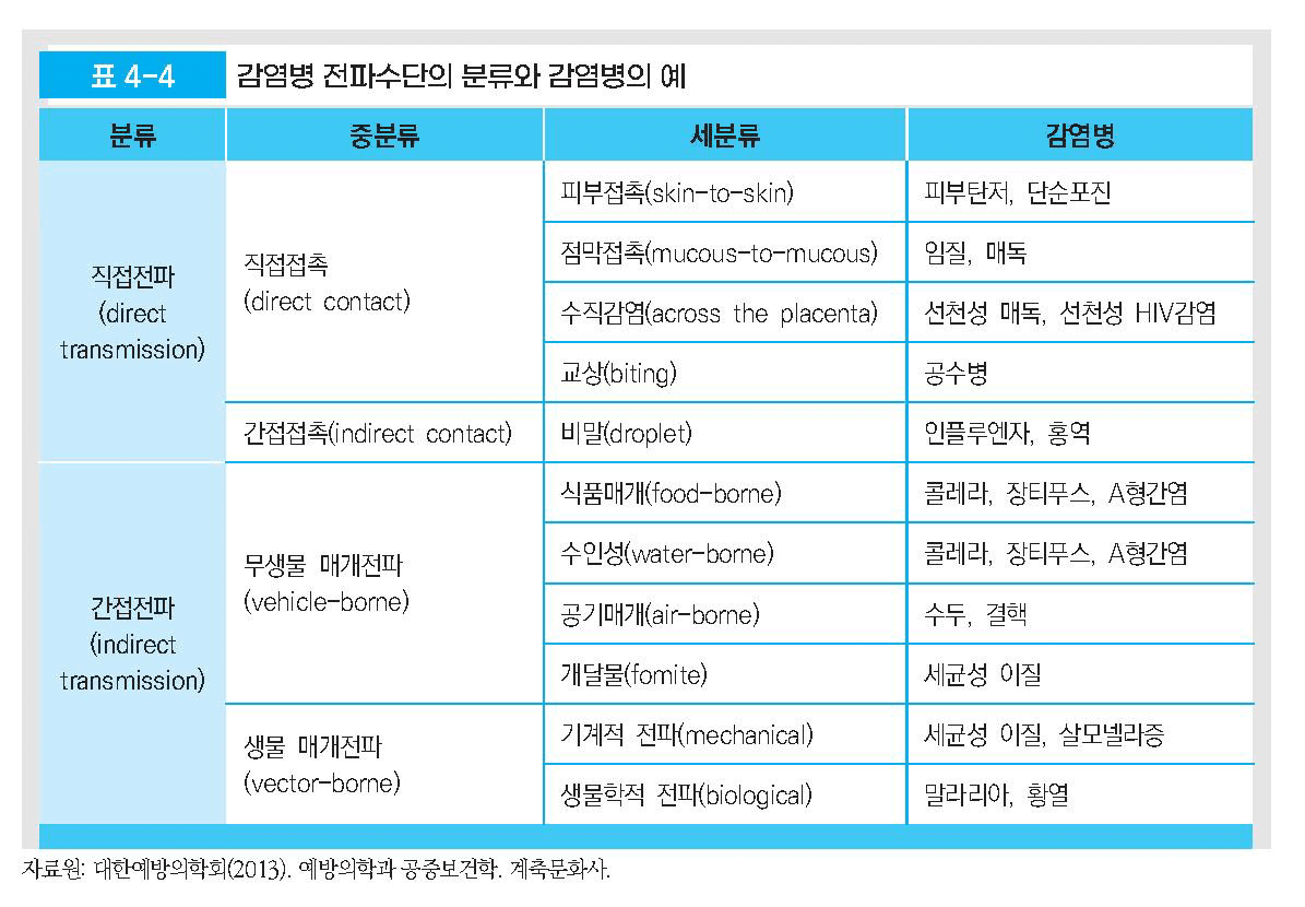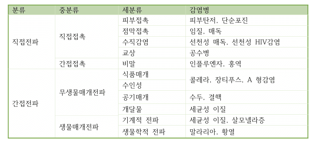 – 전파양식에 따라) 공동 매개물에 의한 전파, 사람 간 전파(person-to-person transmission), 기타 전파로 구분