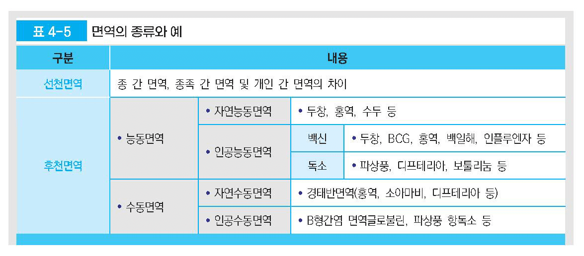 – 능동면역 : 항원과 자연적인 접촉으로 감염되는 자연능동면역과 인공적으로 항원을 접종하여 얻어지는 인공능동면역으로 나뉨