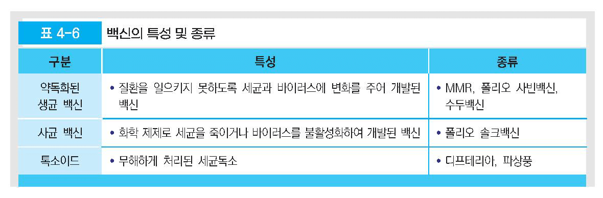 – 인공능동면역 : 인플루엔자, 두창의 일반 예방접종, 백신은 약독화된 생균백신, 사균백신, 톡소이드 구분
