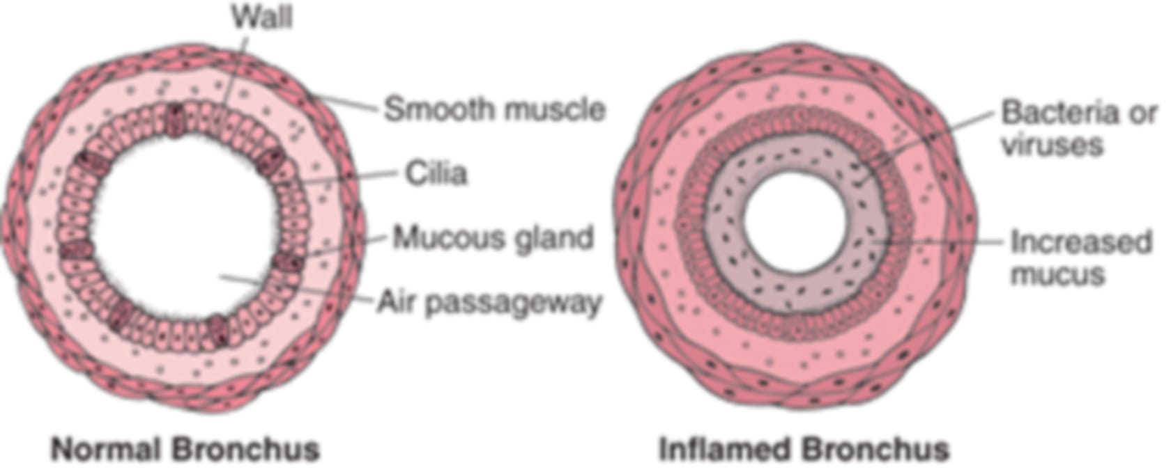 기관지염은 폐로 들어가는 공기 통로인 기관지에 염증이 발생하여 기도가 좁아지고 점액 분비가 증가하는 호흡기 질환을 말한다. 이로 인해 환아는 기침, 호흡곤란, 천명과 같은 증상을 보이게 된다. 기관지염은 크게 급성과 만성으로 구분되며, 이 중 급성 기관지염은 바이러스나 세균과 같은 병원체가 기관지에 침입하여 염증 반응을 일으킨 상태를 의미한다. 특히 인플루엔자 유행 시 소아에게서 급성 기관지염의 발생 빈도가 높아지는 특징을 보인다. 소아는 면역체계가 미숙하고 기도의 직경이 좁기 때문에 작은 염증에도 기도 저항이 급격히 증가하여 증상이 심하게 나타날 수 있다.