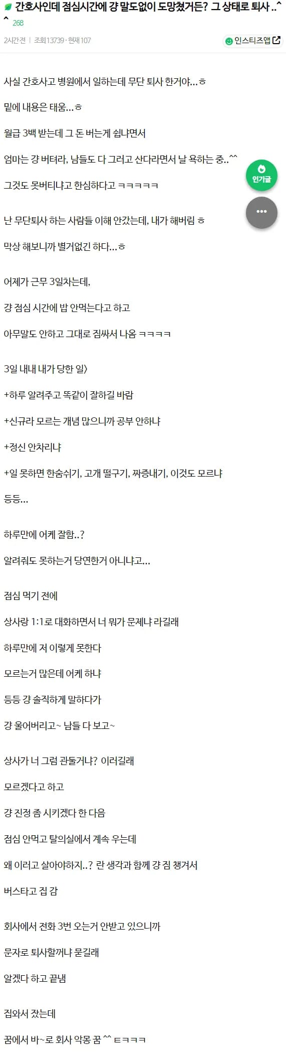 3일만에 태움 때문에 무단퇴사한 간호사 차례 숨기기 3일만에 태움 때문에 무단퇴사한 간호사 관련 응사를 했다 (간호사 태움의 현실)중환자실(ICU) 섬망(Delirium) 평가 완벽 가이드 (CAM-ICU · ICDSC)MRWARE NursingSkill 사이트 주소 (핵심간호술기 실감형 실습)(여성간호학) 임신성 당뇨(여성간호학) 고혈압성 건강문제 01 임신성 고혈압(간호관리학) 간호단위관리 03 의약품관리 Post Views: 515관련태그:3일만에 태움 때문에 무단퇴사한 간호사간호사 태움간호사태움태움 간호사이전간호사의 요청에 초소형 기저귀 만들었다 (유한킴벌리의 응답)다음Tooth-in Eye surgery (자신의 치아로 안구 대체하는 수술)
